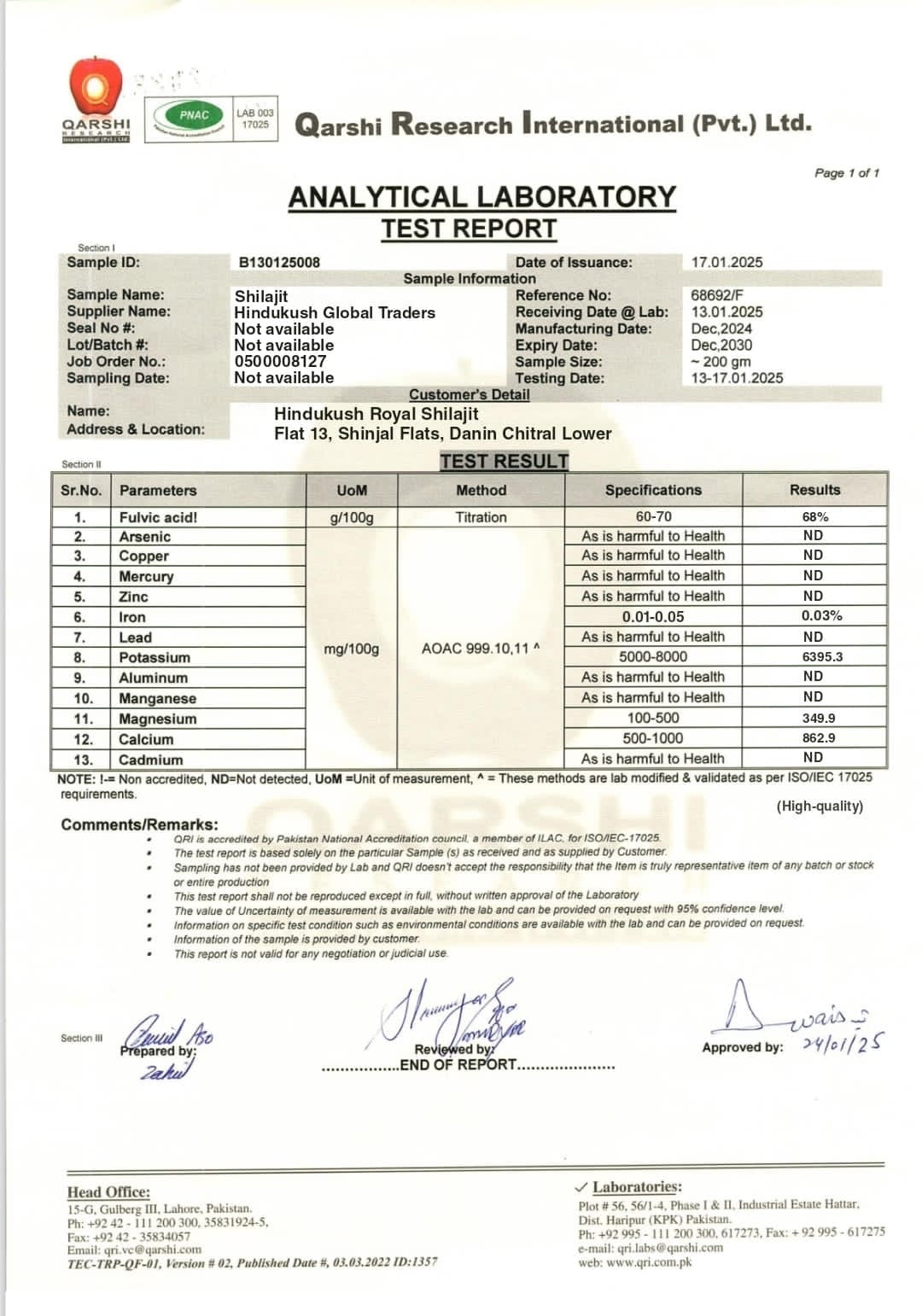 Deze laboratoriumanalyse is uitgevoerd door Qarshi Research International (Pvt.) Ltd. op een monster van Shilajit, geleverd door Hindukush Global Traders. Het doel van de analyse was het controleren van de kwaliteit, veiligheid en samenstelling van het product.